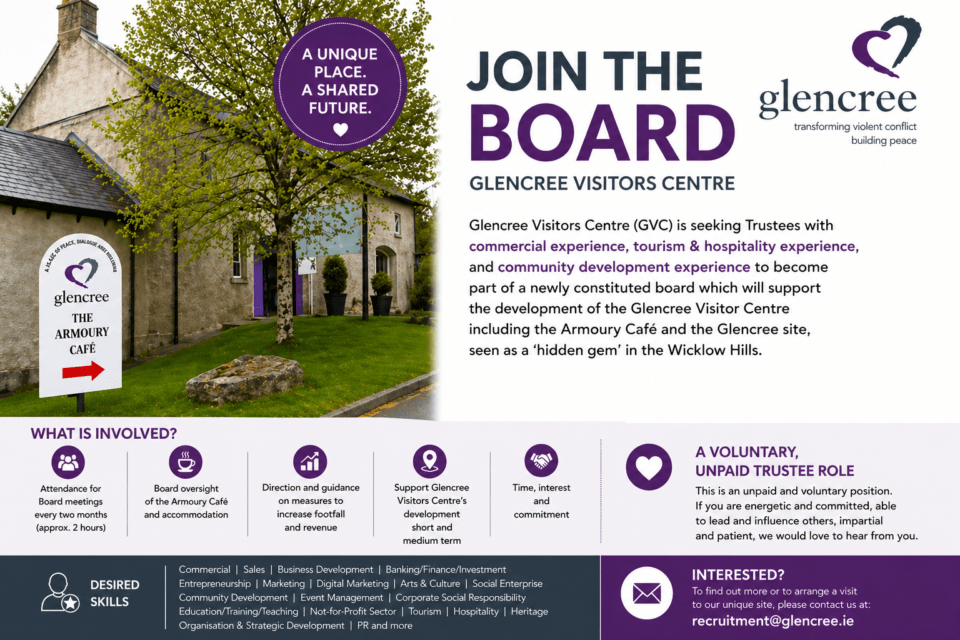The Glencree Centre for Peace & Reconciliation works to prevent and transform political and inter-communal conflict and build peaceful, inclusive societies. We bring individuals and groups impacted by conflict together and help them find pathways to reconciliation and sustained peace through facilitated dialogue, relationship-building, public discourse and shared learning.